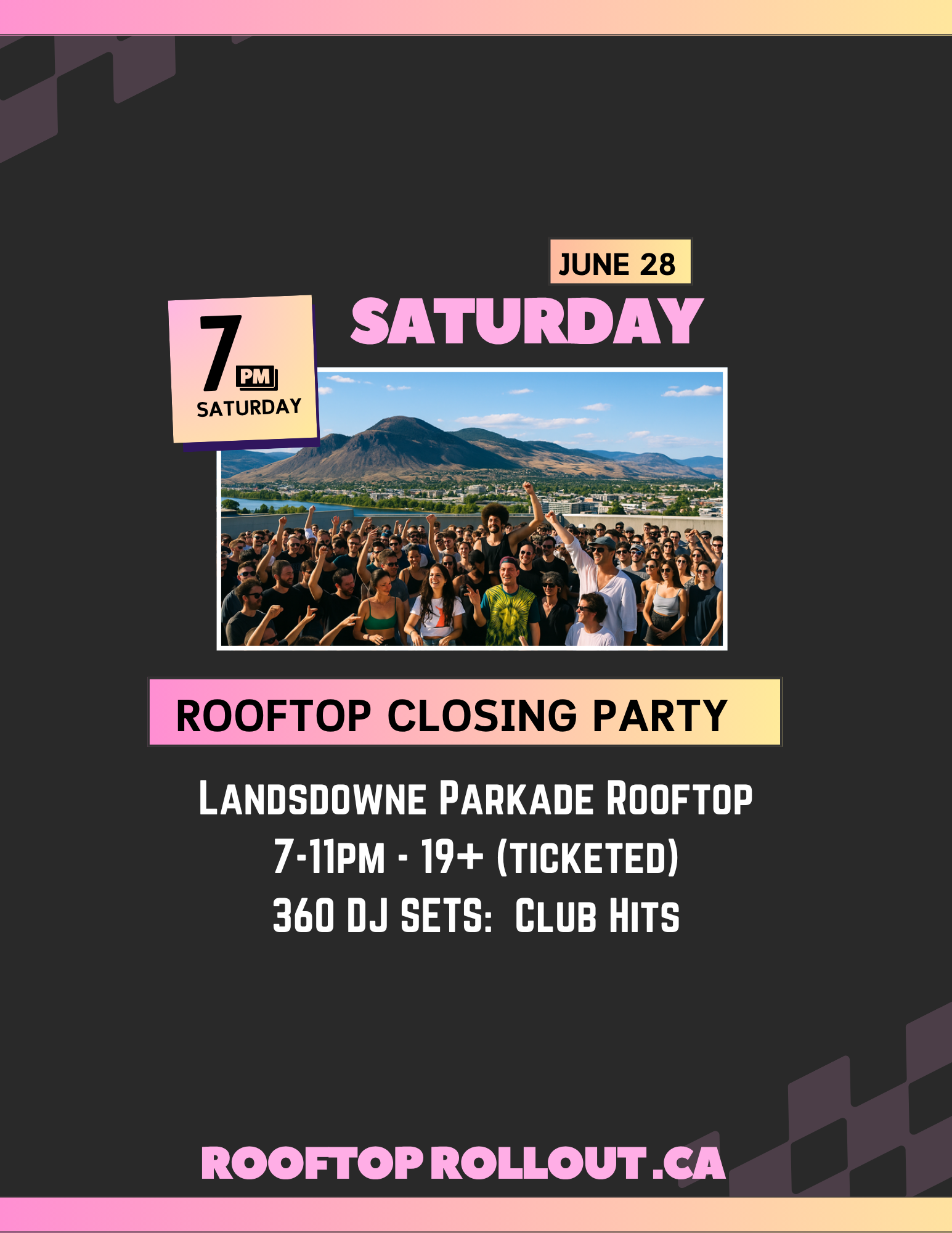 The FINALE to the Rooftop Rollout weekend! This ticket is valid for Saturday night, June 28th from 7-11pm. Saturday night is a throwback club event, 19+, 360 stage on the rooftop of the Lansdowne Parkade. This night is focused around throwback and current club hits. Limited amount of tickets available. It may not be sold on location if our capacity is hit online.